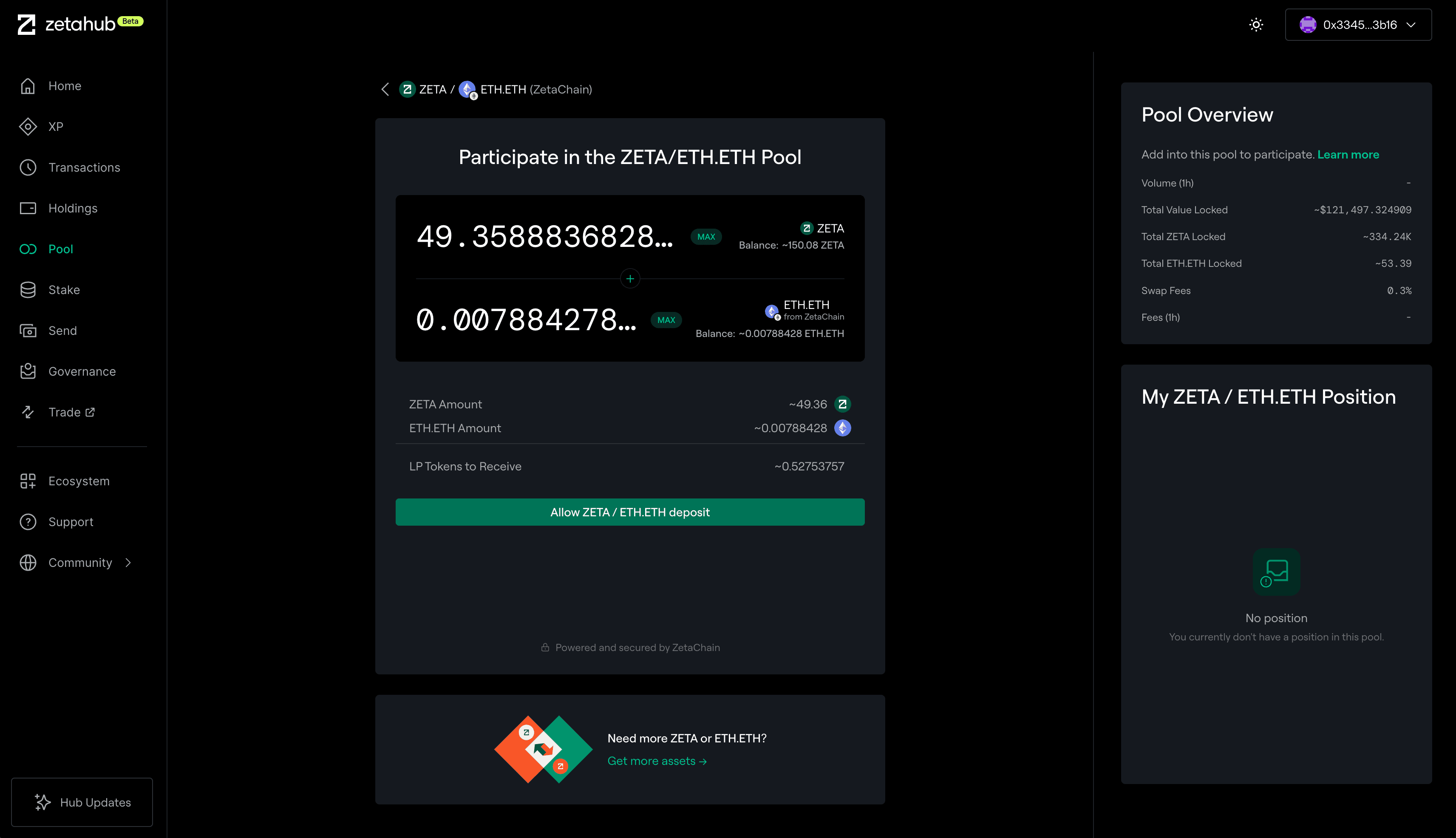 To deposit into any ZetaChain pool, ensure you have a sufficient balance of both respective assets on the ZetaChain network.